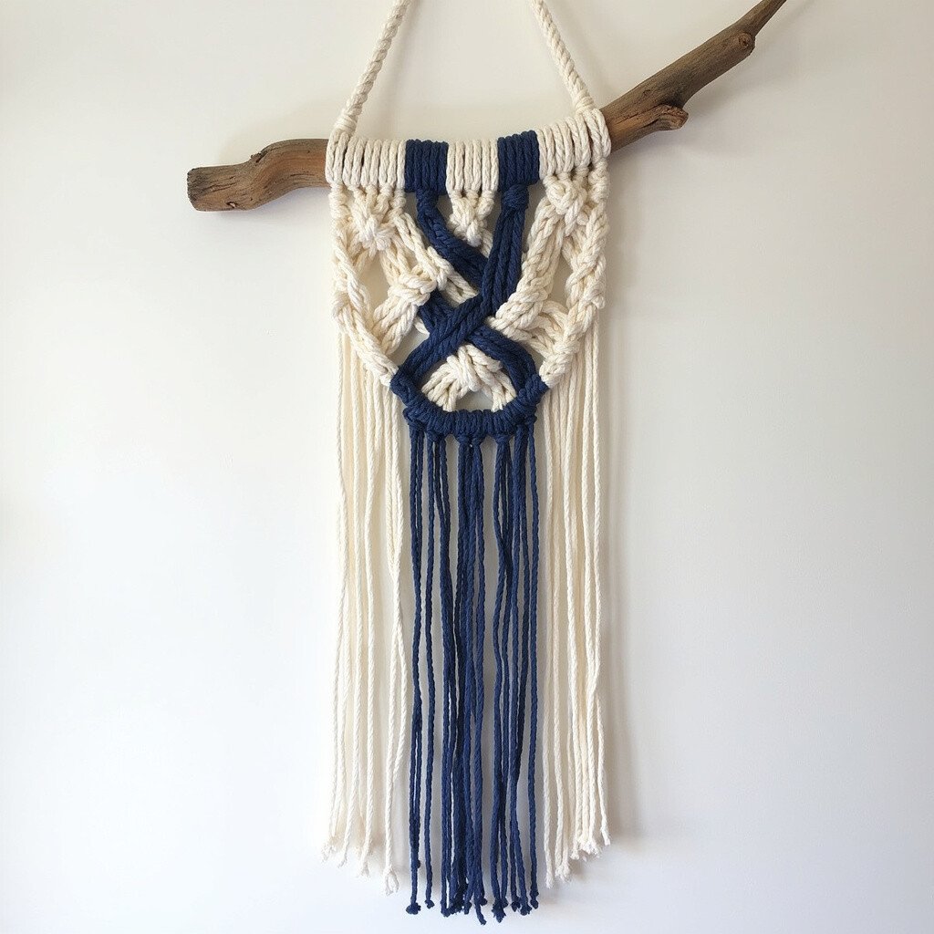 Sail away with the Nautical Knots macrame. Using navy and white cords, this piece brings a maritime feel to your decor. The driftwood enhances the sea-inspired theme.