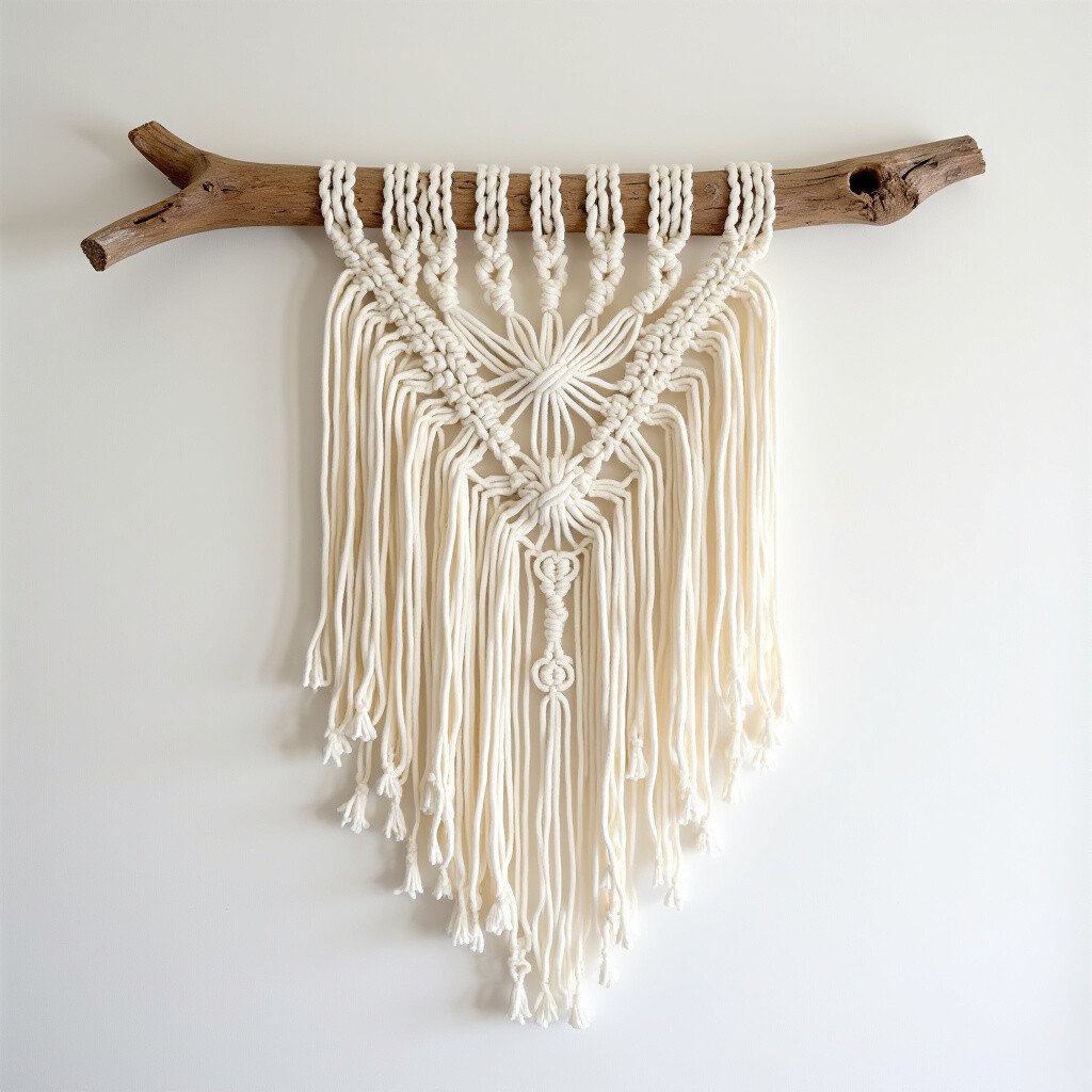 For a contemporary twist, the Modern Geometric macrame offers clean lines and bold shapes. The driftwood provides a natural contrast to the structured design.