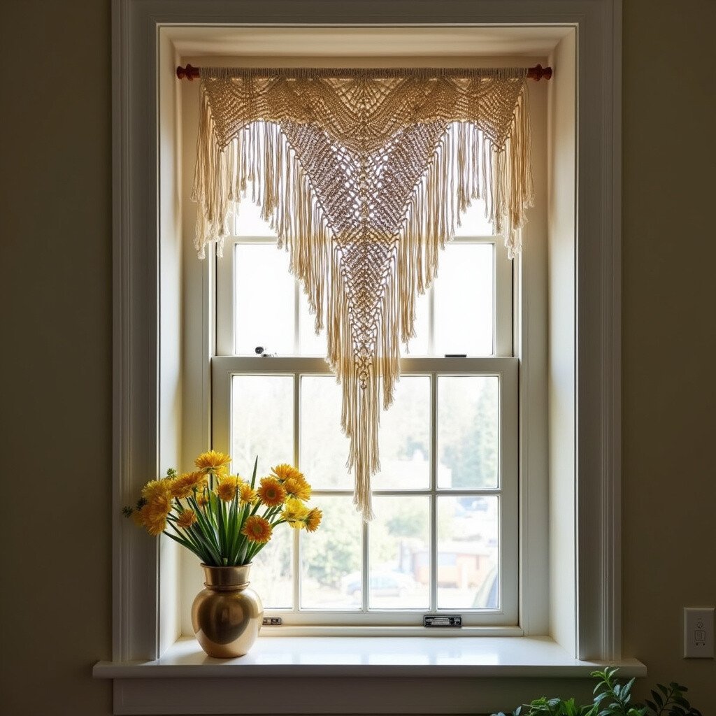 Let the light dance with a macrame window hanging. This idea combines beauty and functionality, acting as a decorative curtain that filters sunlight. It’s perfect for adding privacy and style to any window.