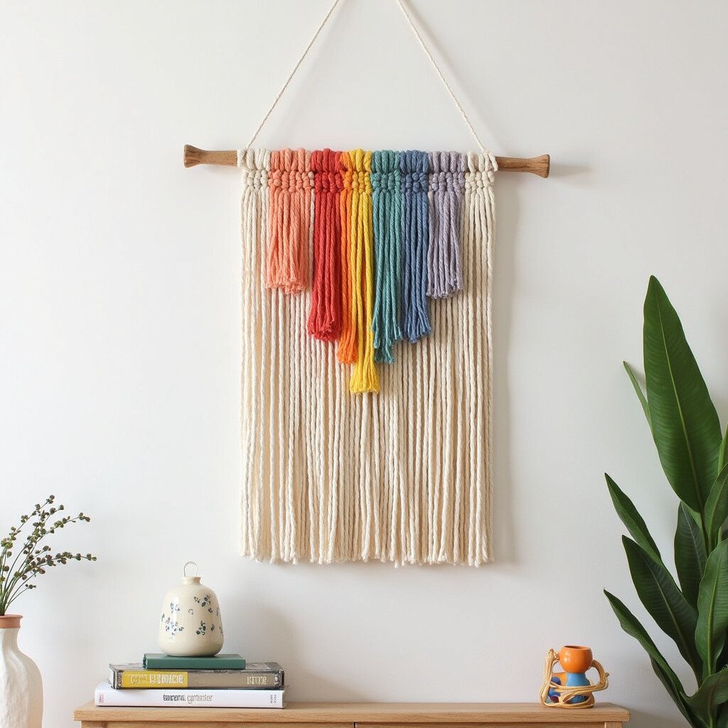 Add a splash of color with a vibrant macrame wall hanging. This idea breaks away from the traditional white or beige, offering a palette of possibilities. It’s perfect for adding personality to a dull wall or a fun touch to a child’s room.