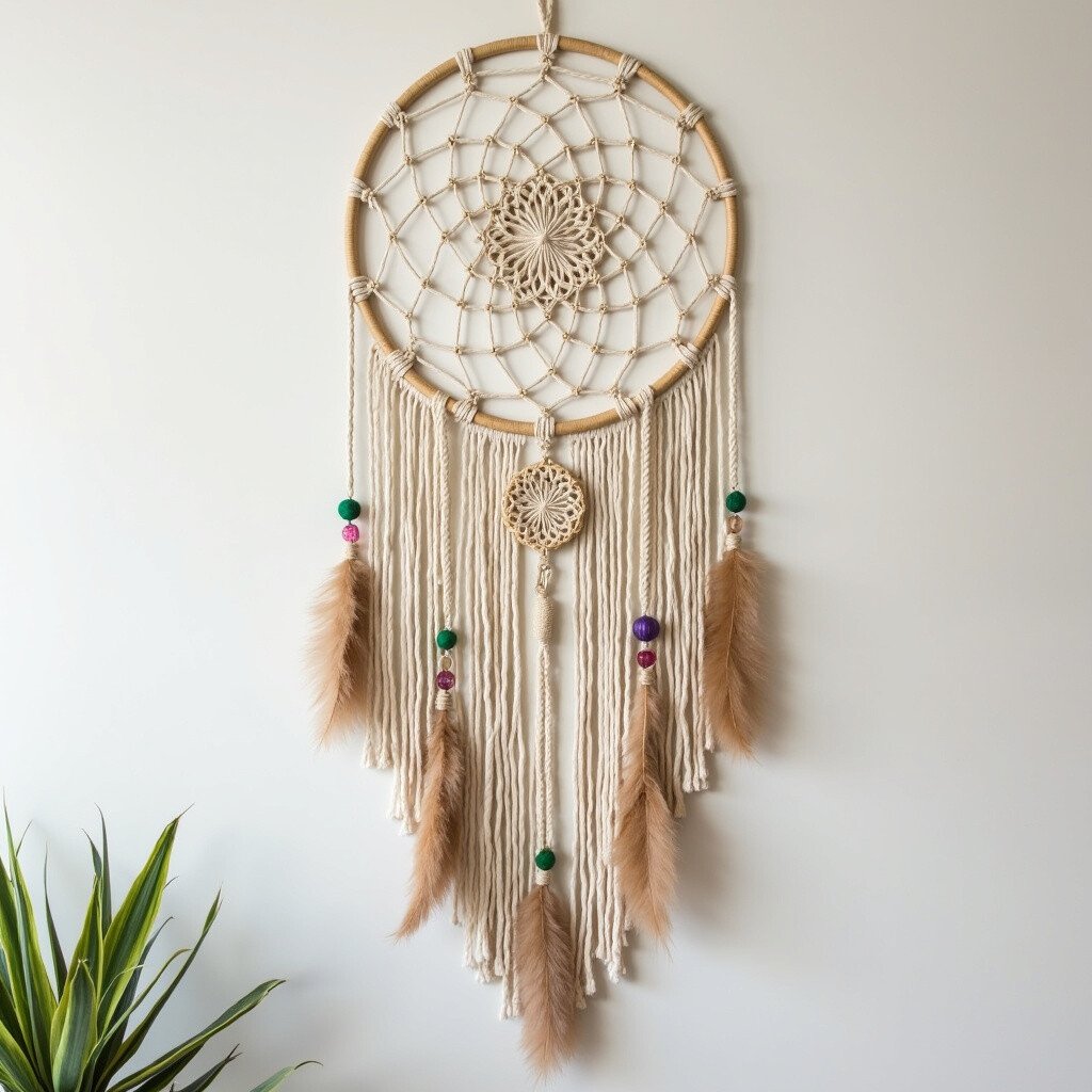 Think of a dreamy blend of tradition and style. A macrame dreamcatcher on your wall is not just decorative but also adds a boho-chic vibe. It’s perfect for your bedroom or living room, creating a focal point that whispers serenity.