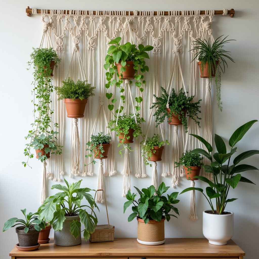 Bring the outdoors in with a macrame plant hanger wall. This idea blends the beauty of nature with the art of knotting, creating a living wall that’s both vibrant and calming. Perfect for plant lovers, it transforms your greenery into a vertical garden.