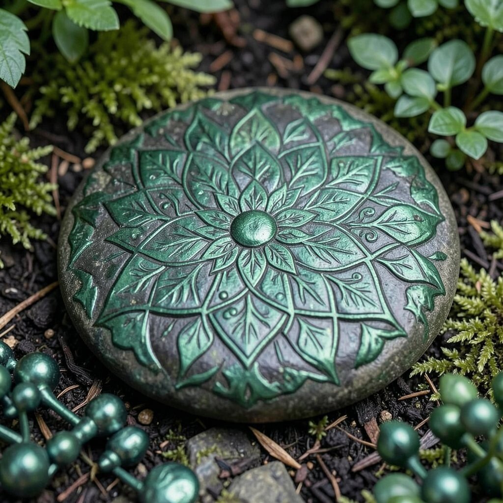 Step into the mystical with this forest-themed stone. With deep greens and intricate leaf patterns, it’s like a walk through an enchanted forest. It invites mystery and magic into your garden.