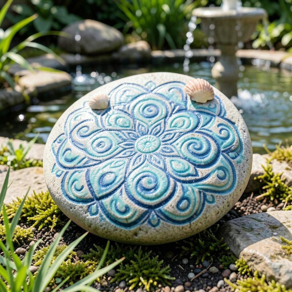 Feel the calming waves of the ocean with this mandala stone. Its blue and turquoise swirls mimic the gentle flow of water. Inspired by the sea, this stone brings a serene vibe to any garden space.