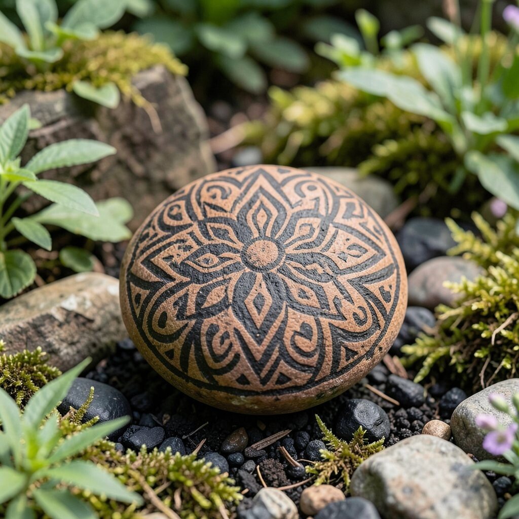 This stone is like a mini sun tucked away in your garden. With bright yellow and orange hues radiating from the center, it brings warmth and cheer to any corner. The circular patterns symbolize endless positivity.