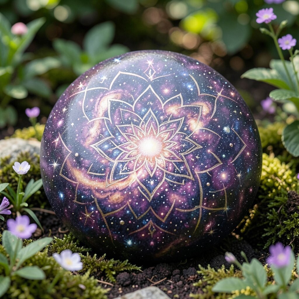 Step into the universe with the Cosmic Dream Mandala Stone. With swirling galaxies and nebulae patterns, it’s a piece of interstellar art. The deep purples and star-like dots create an otherworldly feel.