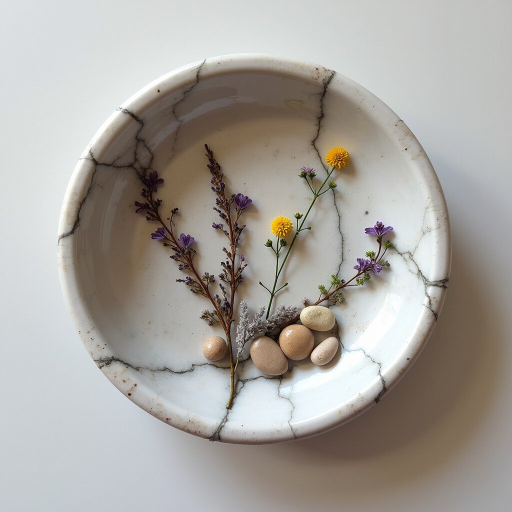 Adding natural elements like small stones or pressed flowers can give your dish an organic feel. It creates a connection to nature and adds texture to the design.