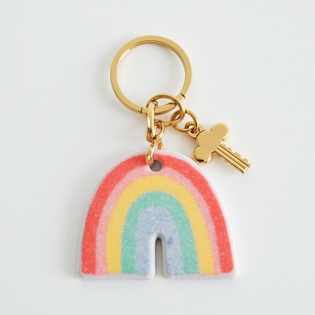 Bring joy to your day with a rainbow-themed keychain. Hand-painted stripes of colorful hues make for a cheerful accessory.