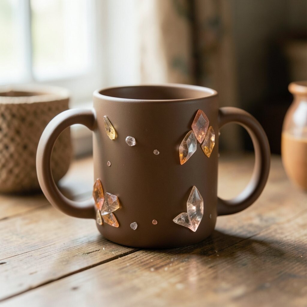 If you prefer a more grounded and natural look, earth-toned mugs with crystalline accents are ideal. Browns, beiges, and subtle oranges create a cozy, warm feeling.