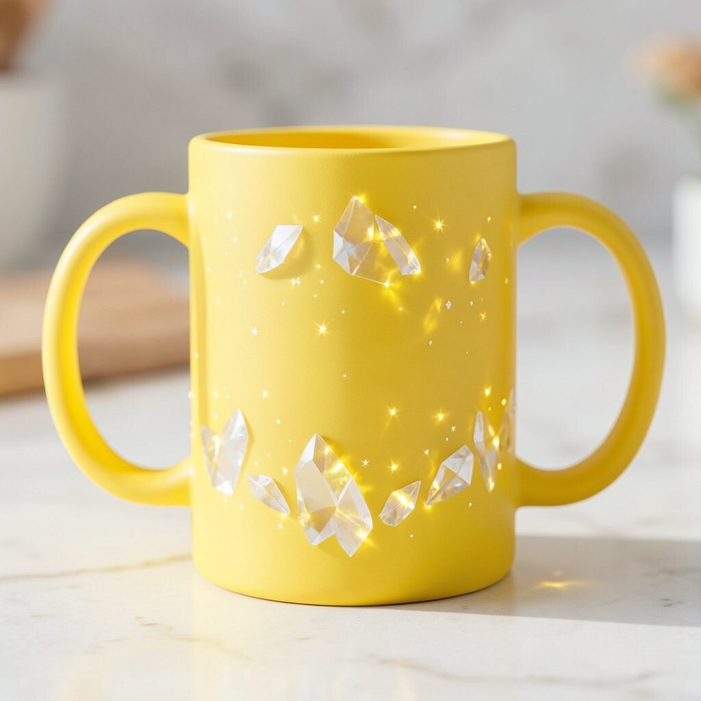 Bring a bit of sunshine into your day with a yellow mug that sparkles like the sun. This bright, cheerful design is perfect for morning coffee or tea.