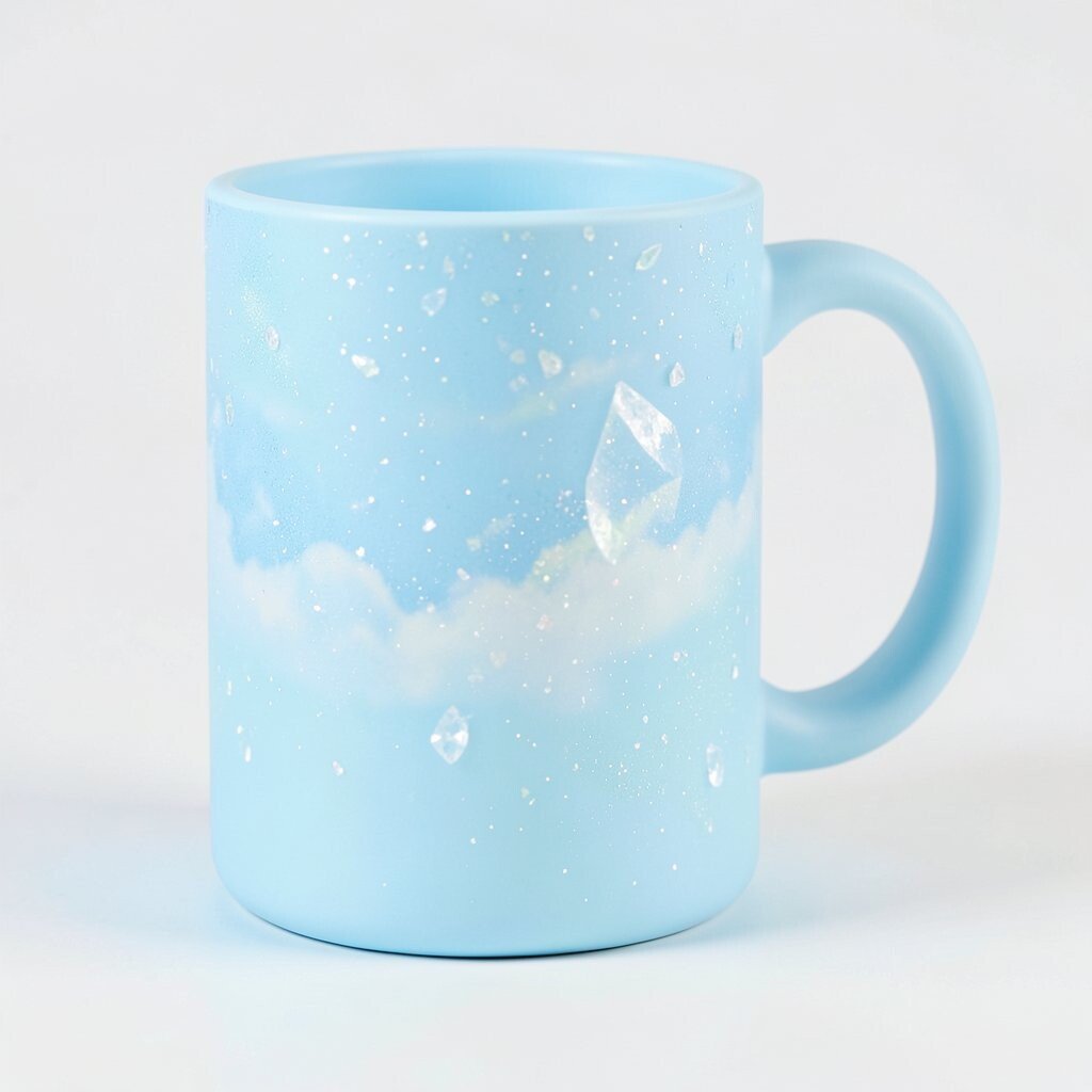 Choose a soft sky blue base and add a shimmering overlay for a dreamy design. This mug is perfect for those who love light and bright colors. Sky blue is a versatile choice that pairs well with many styles.