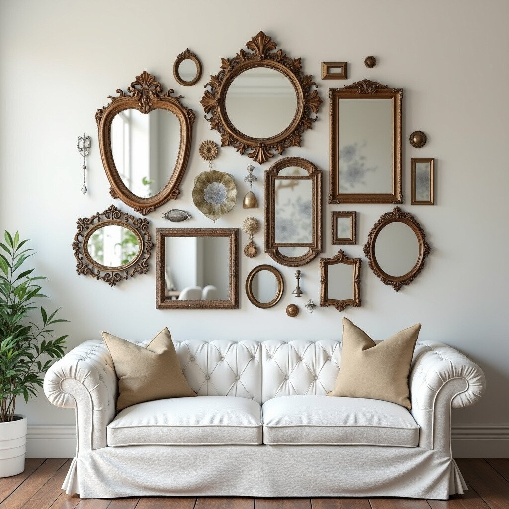 Create a gallery wall of antique mirrors for a unique, eclectic look. This idea is perfect for those who love vintage decor.