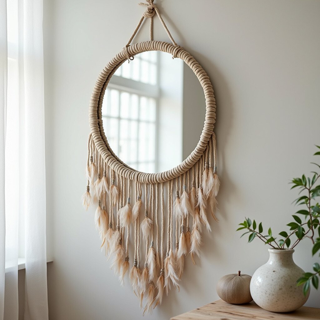 Turn your mirror into a dreamcatcher! This whimsical idea is perfect for those who love boho style. The delicate weave of a dreamcatcher around a mirror adds a mystical touch.