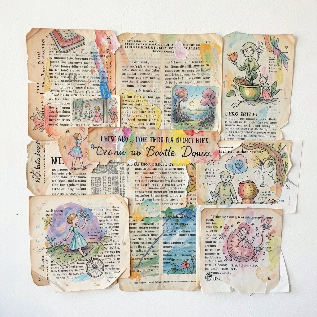 Use old book pages to create a narrative within your collage. Pair with illustrations or drawings for a whimsical feel. It’s like crafting a visual storybook on your wall.