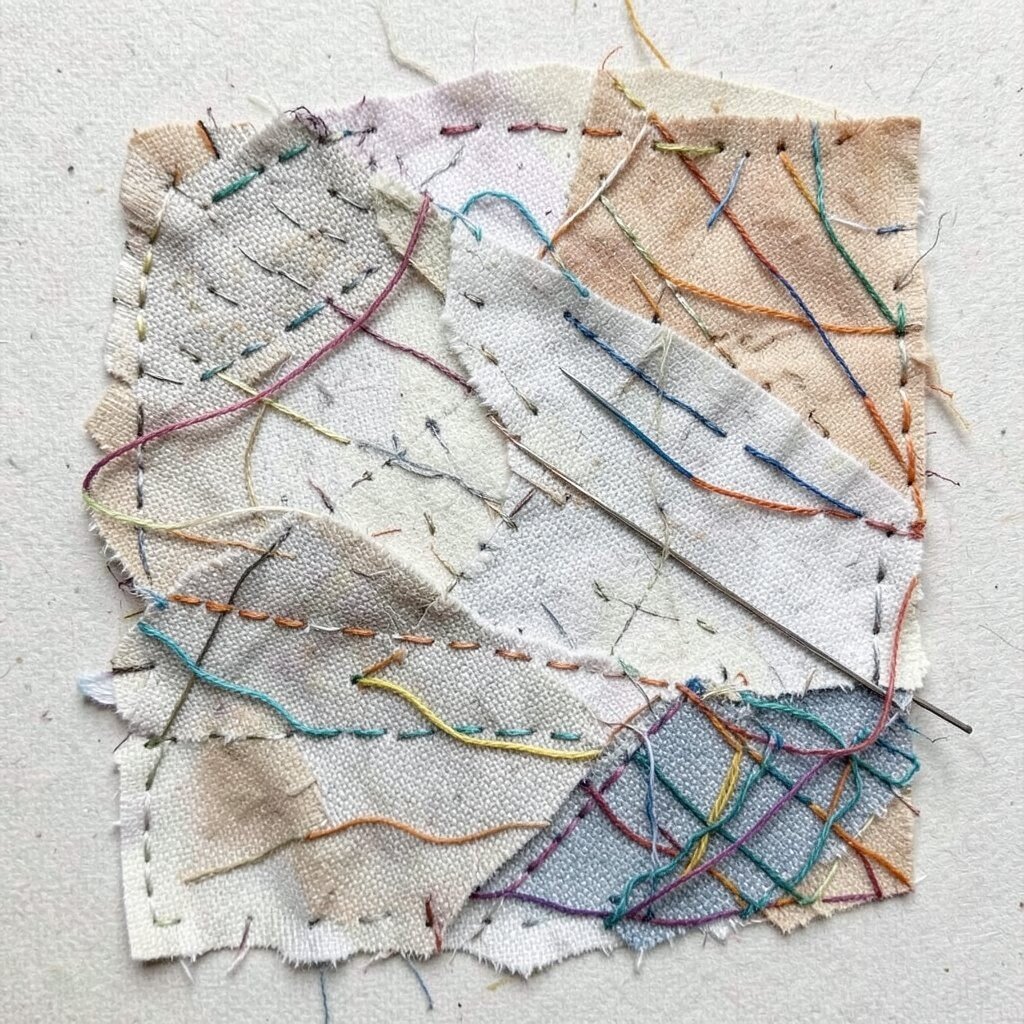Thread and needle can add an unusual touch to your collage. Stitching fabric or paper adds texture and a personal, handmade feel. It’s like writing a story with thread!