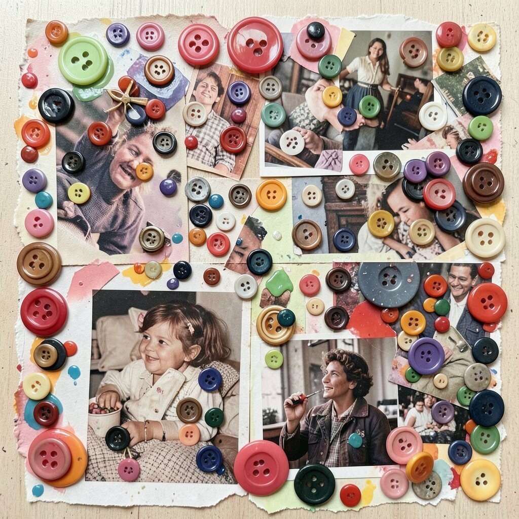 Buttons can be found in sewing kits or craft stores. Glue them around photos or use them to form shapes. They’re perfect for creating a whimsical feel or adding a touch of vintage charm.