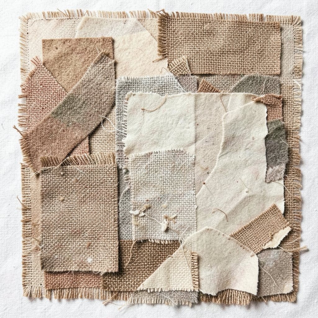 Layer textiles with paper and other materials. Natural hues work well for a relaxed, organic feel. Textile collages are perfect for adding a homey touch to any space.