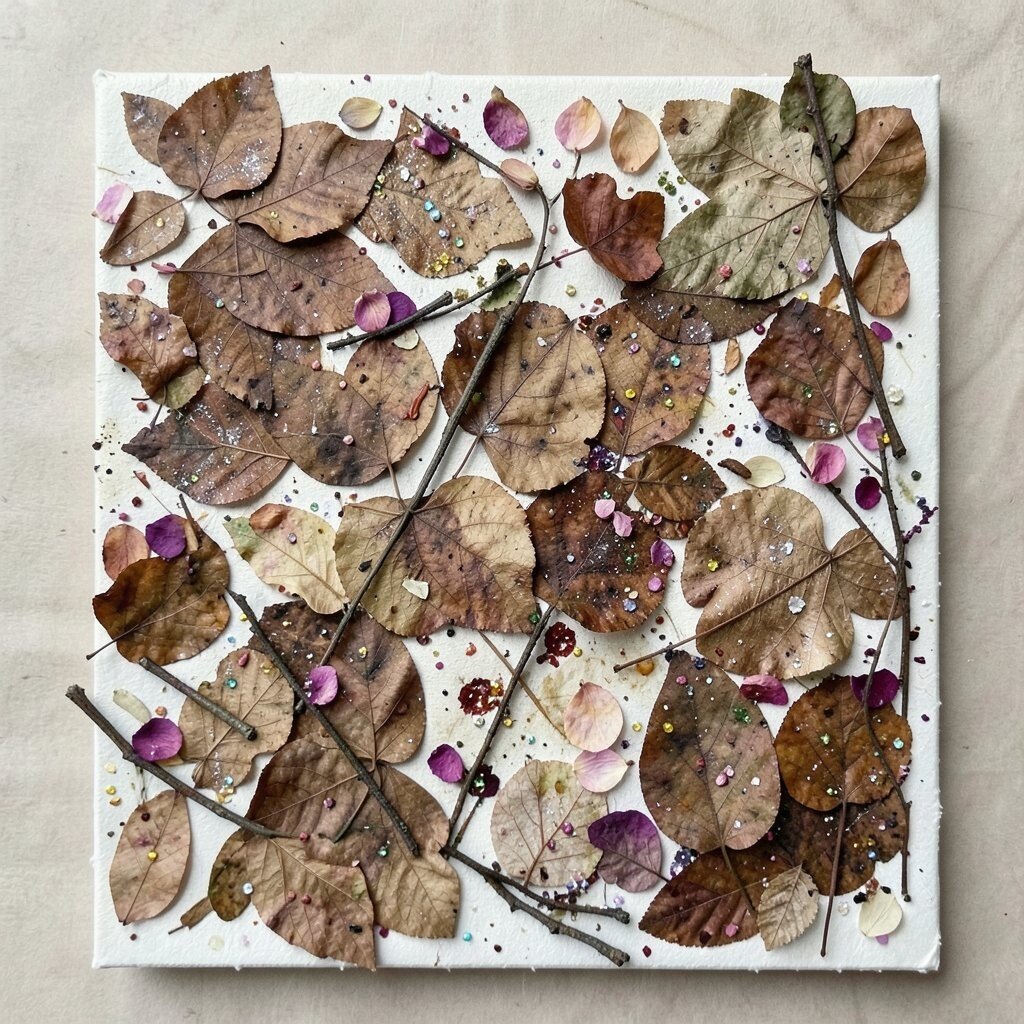 Imagine using dried leaves, twigs, and flower petals as your main art supplies. Nature’s canvas brings the outdoors to your art table, adding earthy textures and natural beauty. It’s like a breath of fresh air for your living room wall.