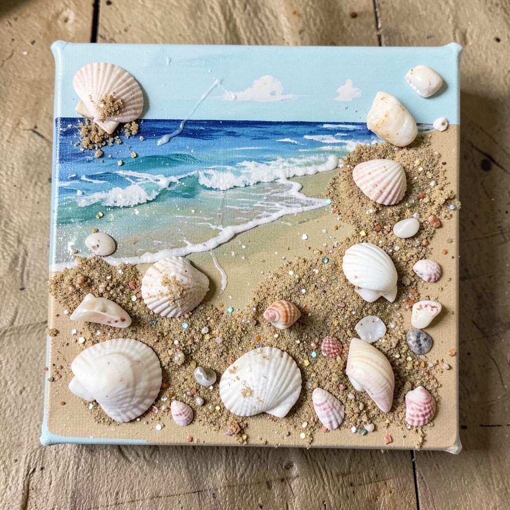 Bring the beach to your art with a collage made from seashells and sand. This idea captures the essence of summer and the sea, offering a piece of tranquility for your space.