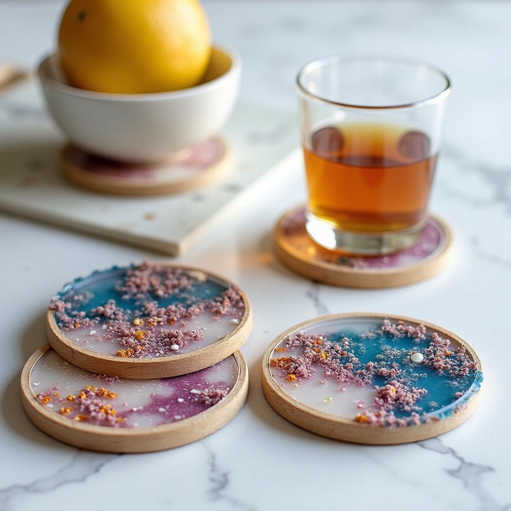 Resin coasters are like little pieces of art for your table. Mix resin with colors, glitter, or botanicals for a unique design.