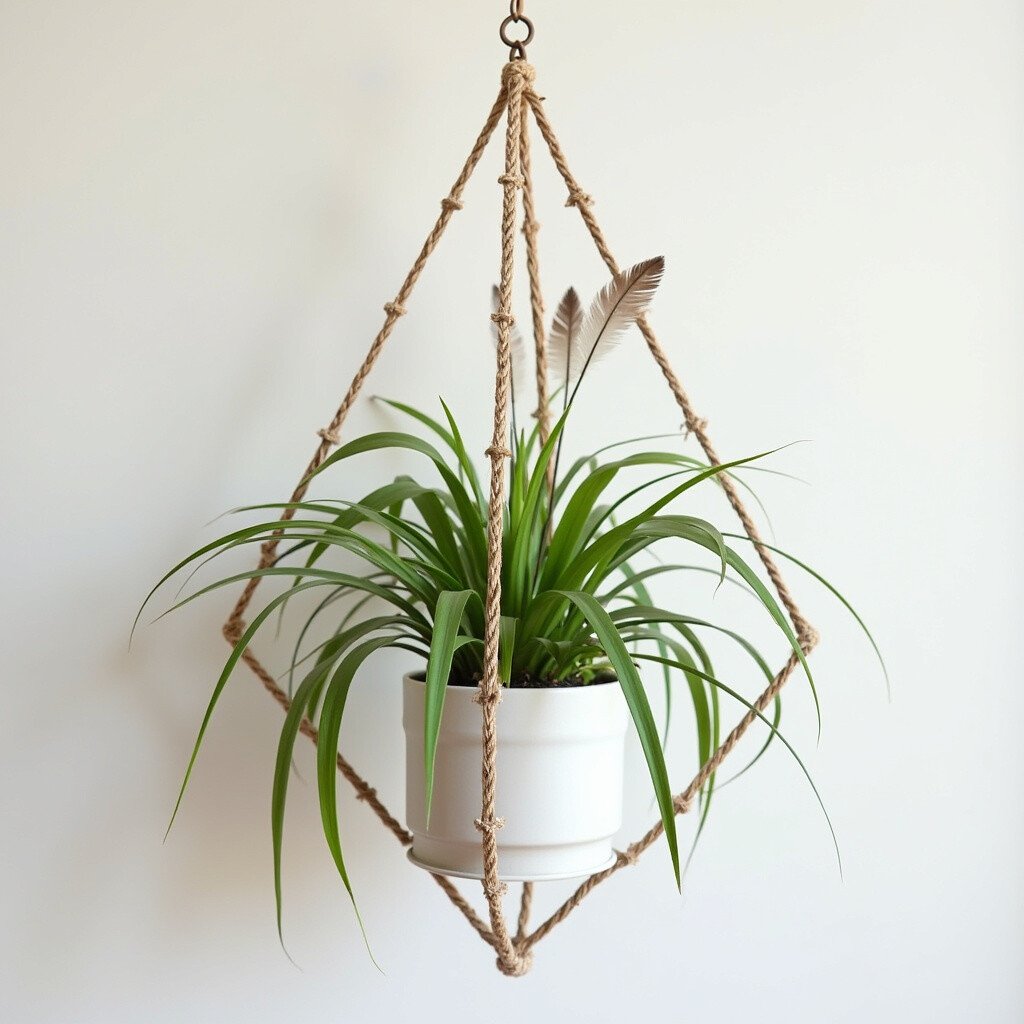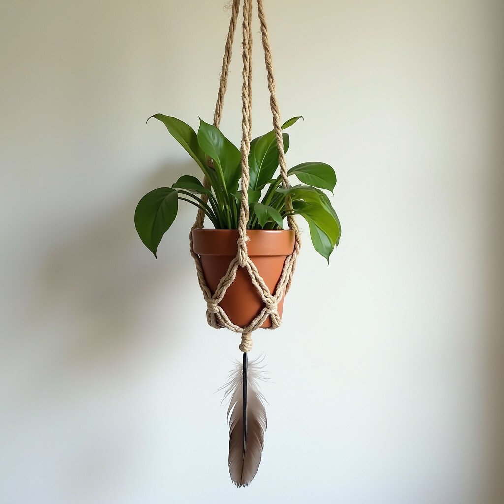 This idea uses rustic twine and earthy feathers for a natural look. Twine wraps around a simple pot, and feathers hang from the bottom, creating a charming, organic feel. It’s like bringing a piece of the forest into your home.