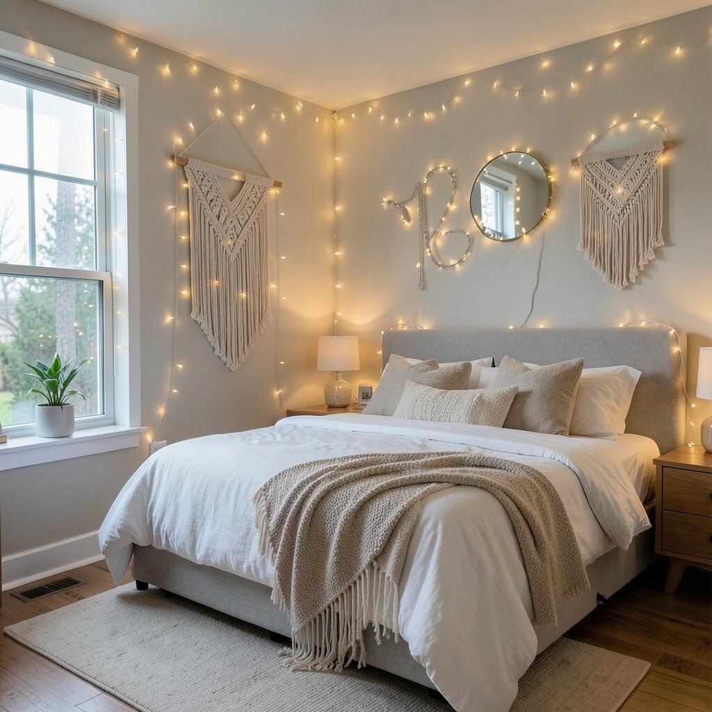 These lights are versatile and can be used in various ways. Create shapes or words on your walls using light strings. For a boho vibe, mix them with macramé or other textiles.