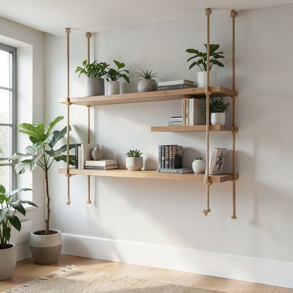 Hanging shelves are a stylish way to display your favorite items. Use wood and rope to create shelves that are both functional and decorative. They’re perfect for showcasing books, plants, or collectibles.