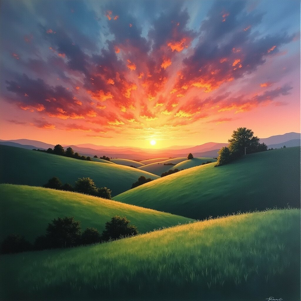 Picture a peaceful scene of rolling hills under a colorful sunset. This idea captures the serenity of the countryside.