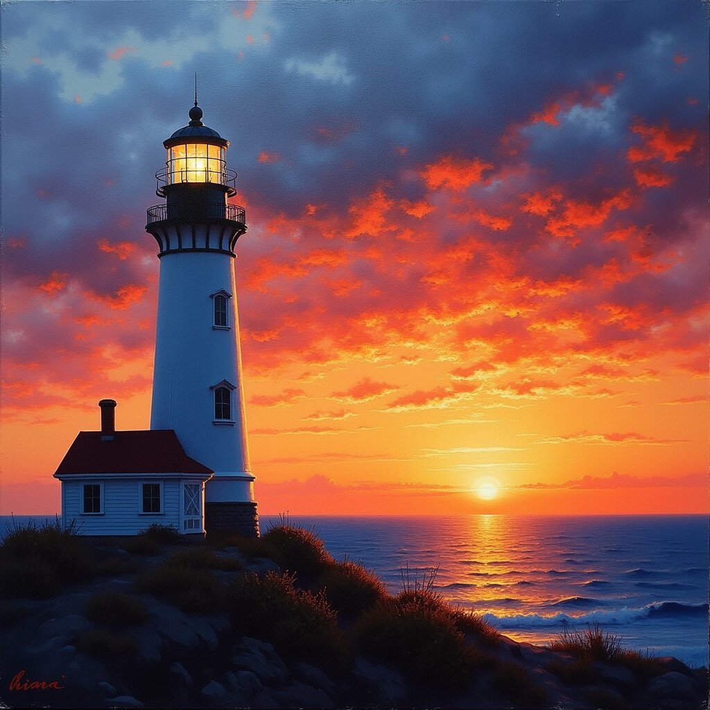 Lighthouses against a sunset sky create a scene of guidance and hope. Imagine painting a sturdy lighthouse with a backdrop of vibrant colors.