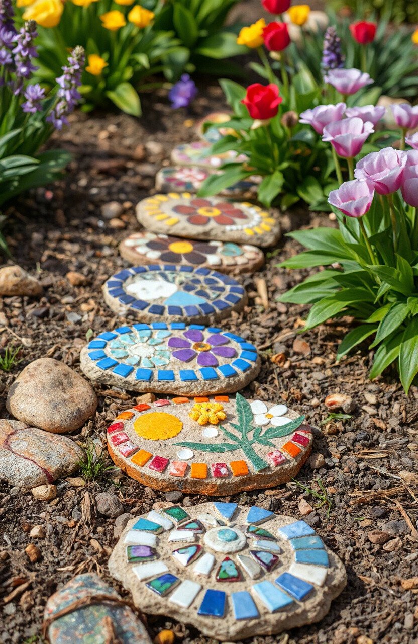 Add a whimsical touch to your garden with mosaic stepping stones. These stones can lead the way through your flowers or to a secret spot.