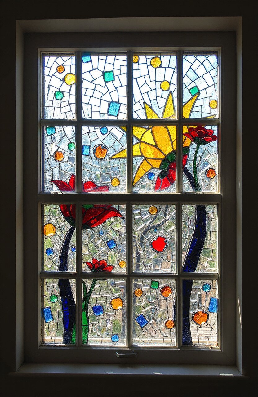 Mosaic window art can transform plain glass into a colorful masterpiece. The light passing through creates a stunning effect.