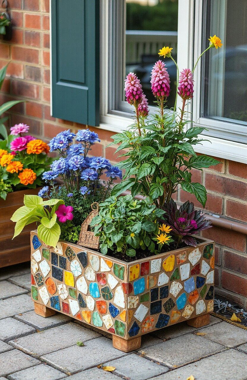 Envision planter boxes that are as eye-catching as the plants within them. By using mosaic tiles, you can transform plain boxes into stunning garden features. Each box can have its own theme or color scheme.