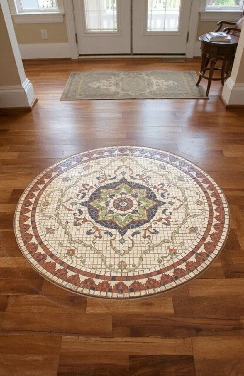 Envision a floor medallion that’s a centerpiece in a room. Made from mosaic tiles, it can be placed in an entryway or living room to add elegance and style. It’s a sophisticated touch that draws the eye.