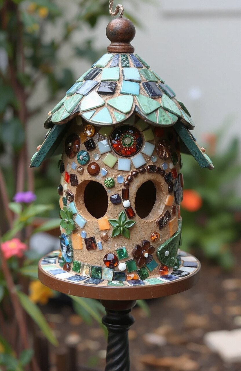 Picture a birdhouse that’s a jewel in your yard, attracting both birds and admiration. By decorating it with mosaic tiles, you create a tiny masterpiece that adds charm to your garden. It’s a delightful blend of nature and art.