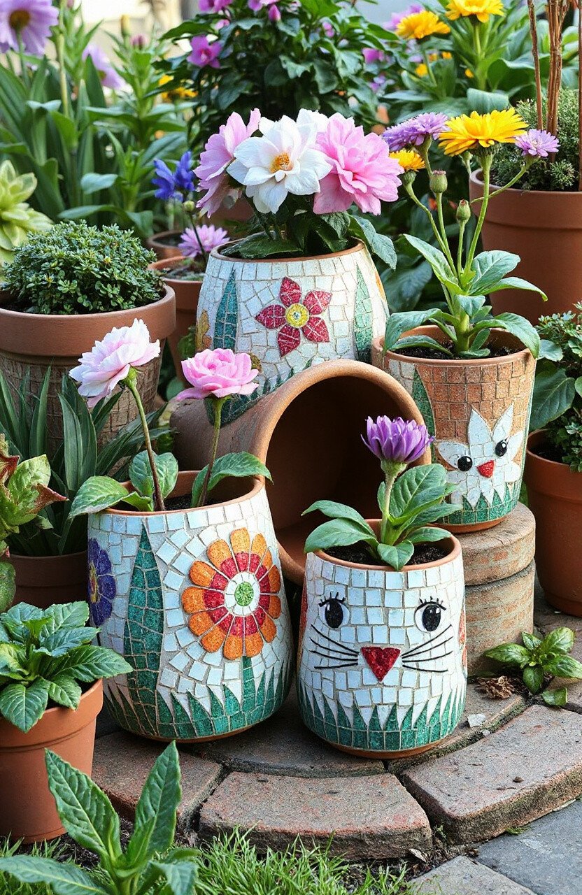 Imagine a garden full of pots, each with its own personality and story. By using small, colorful tiles, you can create whimsical designs on plain pots. These unique pots will make your plants stand out even more.
