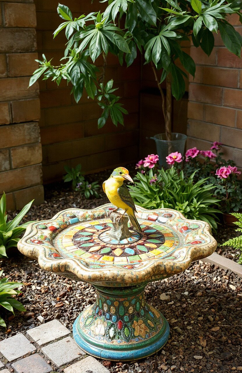Imagine a birdbath that’s a haven for birds and a feast for the eyes. By decorating it with mosaic tiles, you create a colorful oasis in your garden. It’s a piece that brings nature and art together beautifully.