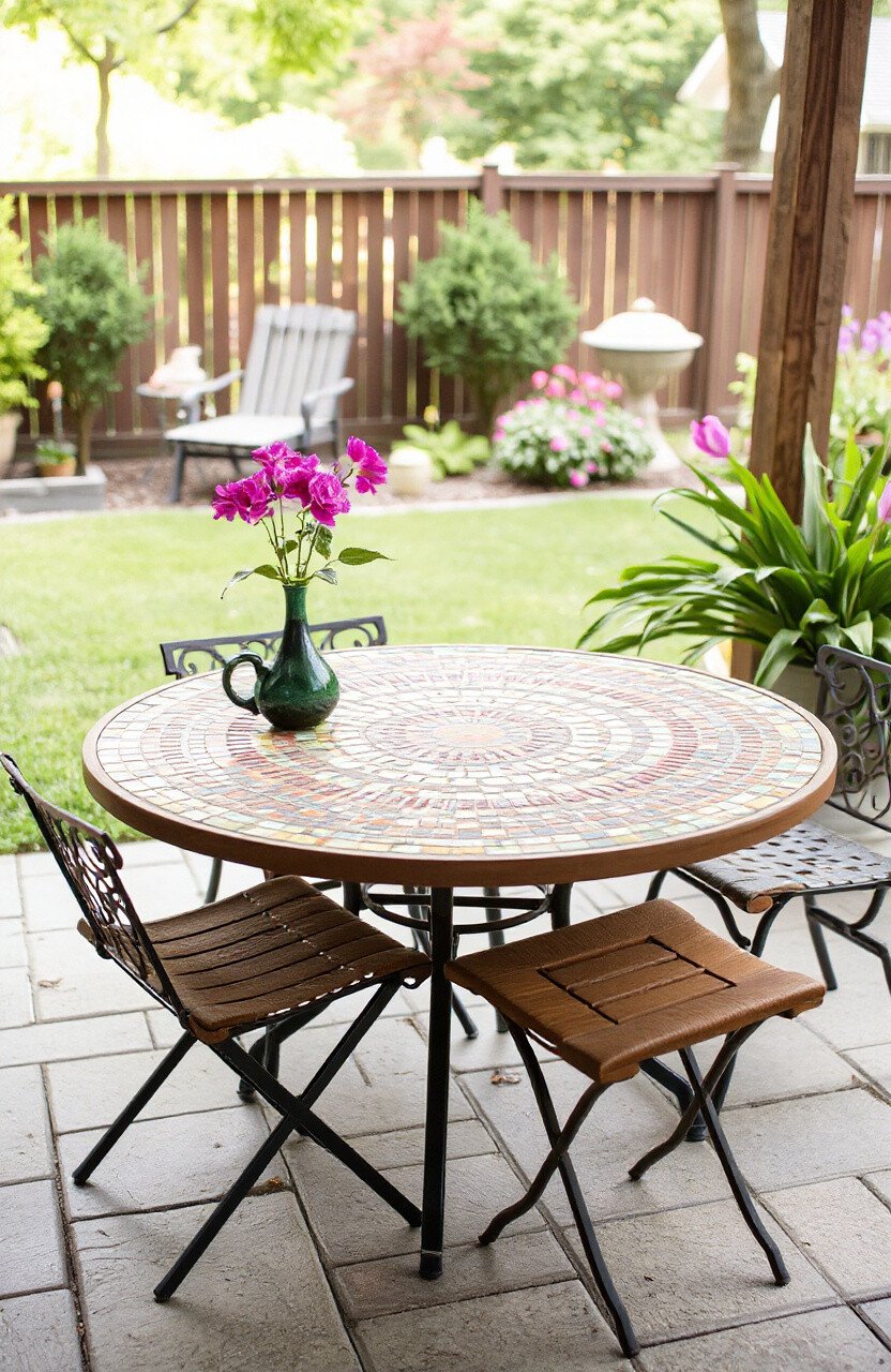 Imagine a patio table that’s as much about art as it is about dining. By adding a mosaic tile top, you create a colorful setting for outdoor meals. It’s a delightful way to enhance your patio decor.