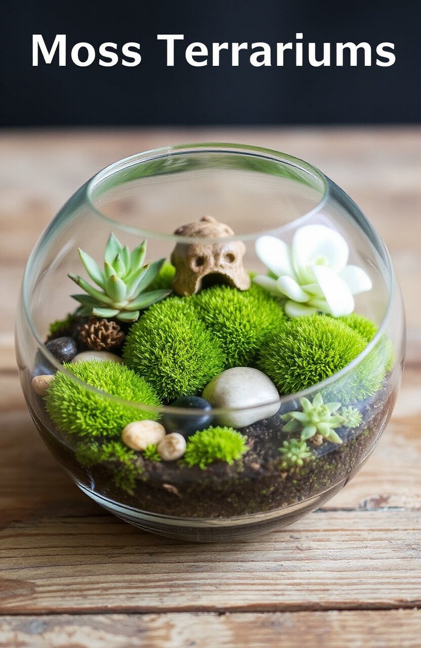 Moss terrariums are miniature gardens that thrive indoors. Layer moss, soil, and small plants in a glass container. These terrariums are low maintenance and visually captivating.