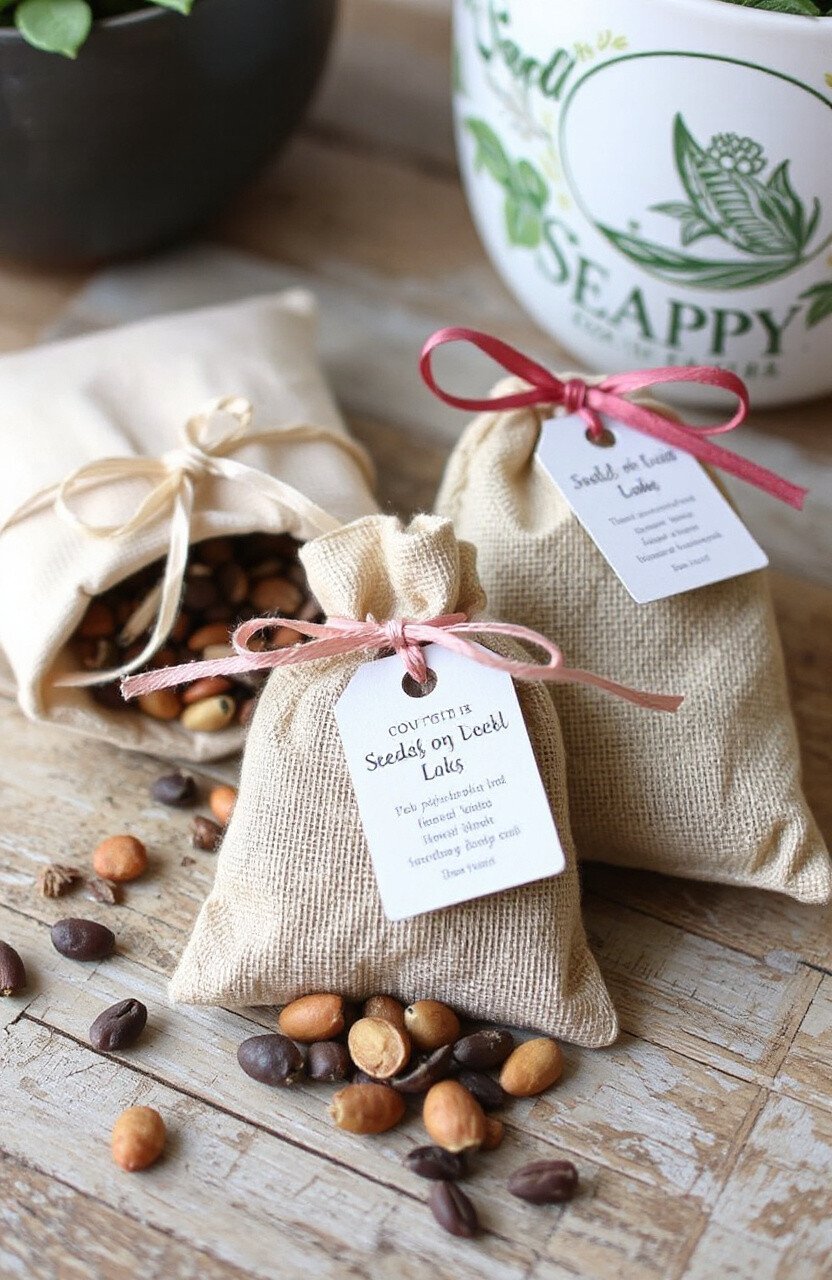 Seed packet sachets are a fragrant way to share the love of gardening. Fill small fabric pouches with seeds and tie them with ribbon. Add a label with planting instructions.