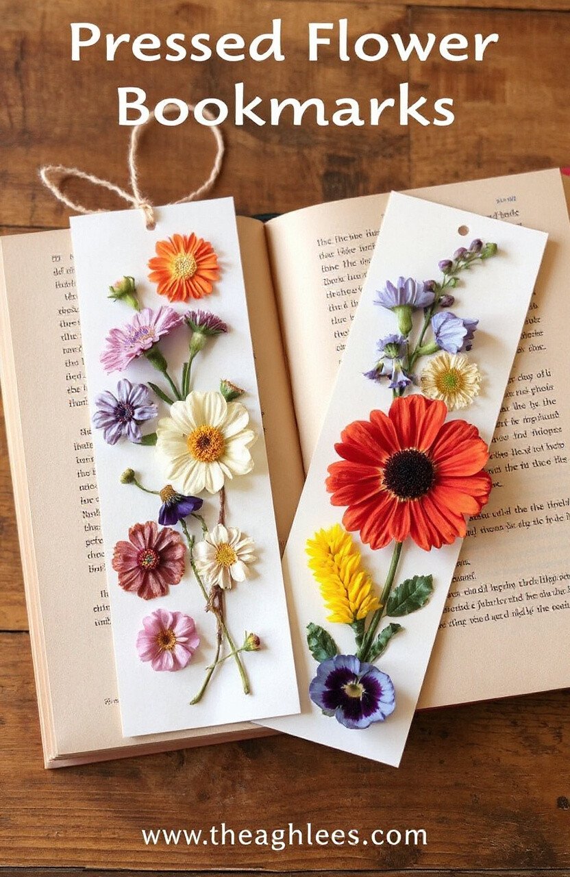 Pressed flower bookmarks combine functionality with beauty. Gather flowers of various colors and press them between the pages of a heavy book. Once dried, arrange them on cardstock and laminate them for durability.