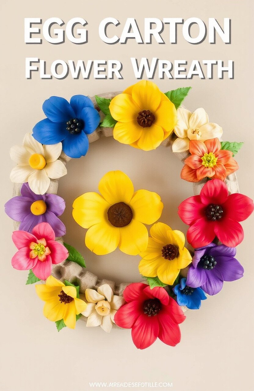 Egg carton flower wreaths are a creative way to upcycle and decorate. Cut egg cartons into flower shapes and paint them in vibrant colors. Attach them to a circular base to form a wreath.
