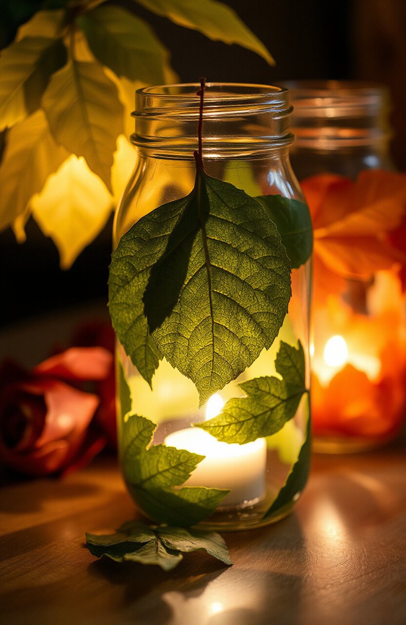 Leaf lanterns cast beautiful shadows and create a cozy atmosphere. Glue pressed leaves onto a glass jar and place a candle inside. The light shines through the leaves, creating intricate patterns.