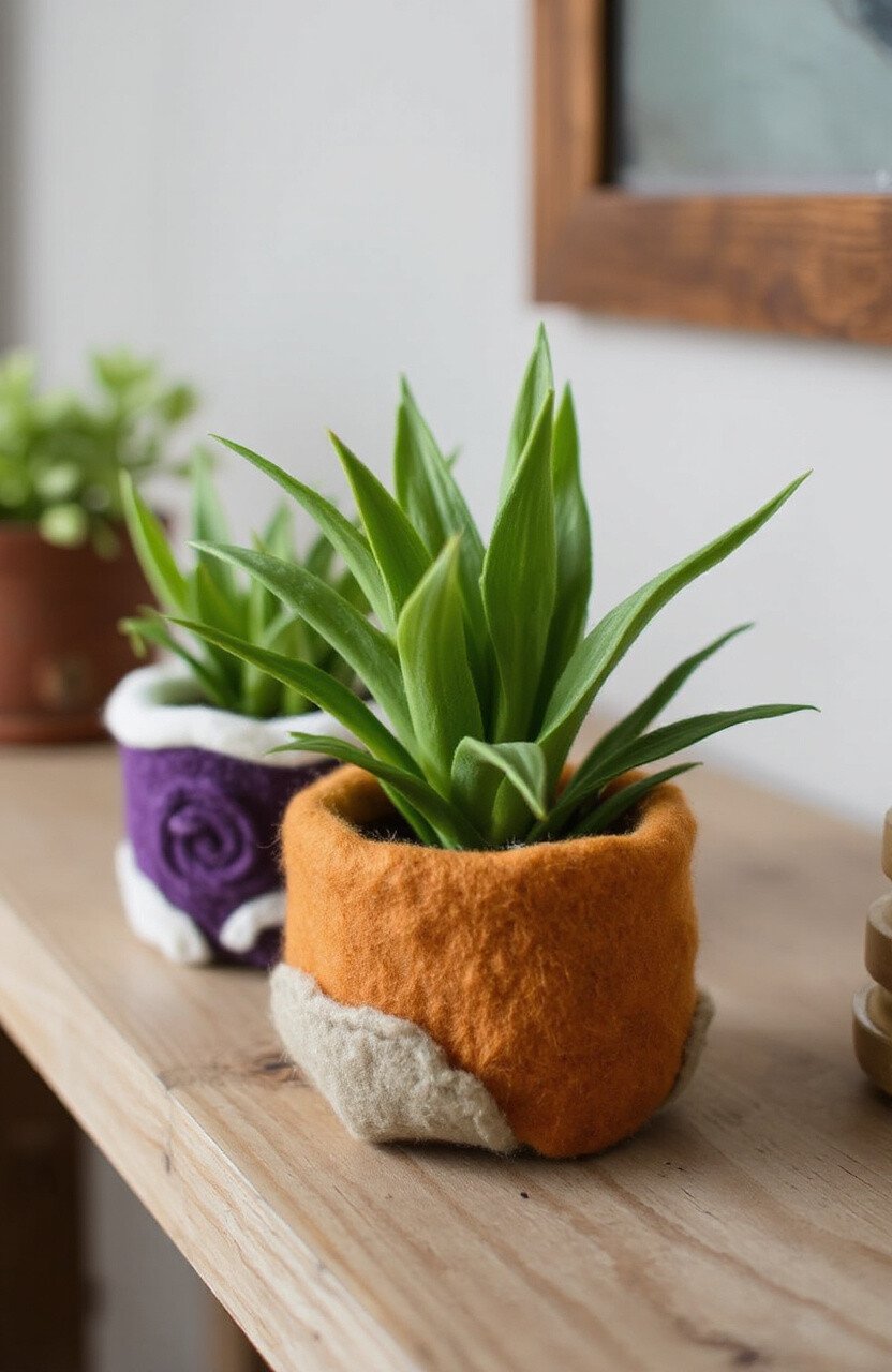Add a touch of nature to your home with felted planters. They can hold small pots or be decorative sleeves. Choose earthy tones for a natural look.