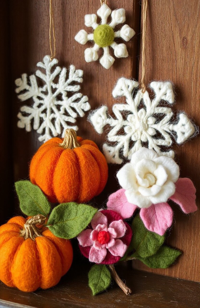 Celebrate each season with wool decorations. Pumpkins for fall, snowflakes for winter, and flowers for spring. These make your home festive all year round.