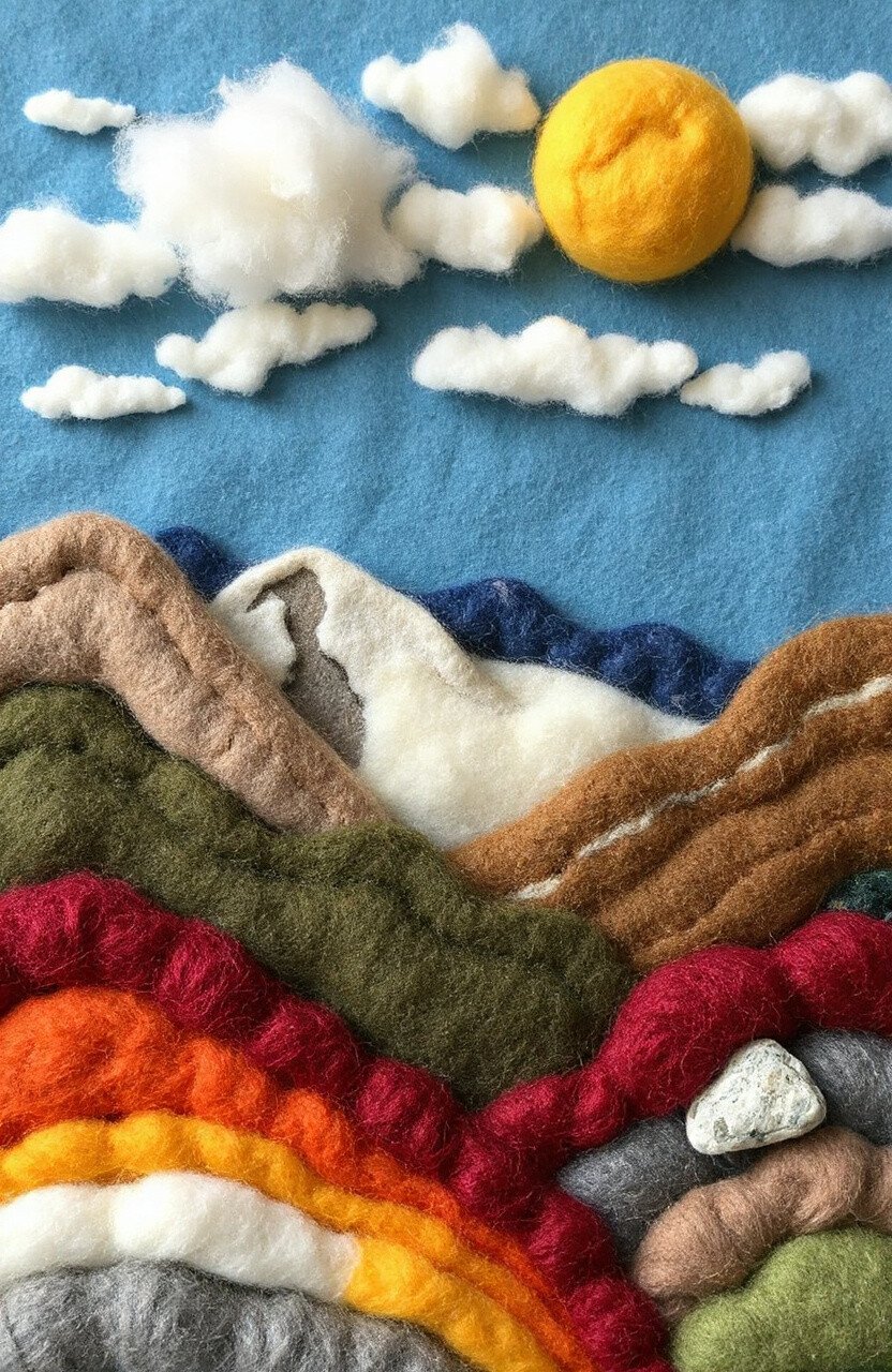 Create beautiful scenes with layers of colored wool. Picture a serene mountain view or a sunny beach. The textures and colors let your imagination run wild.