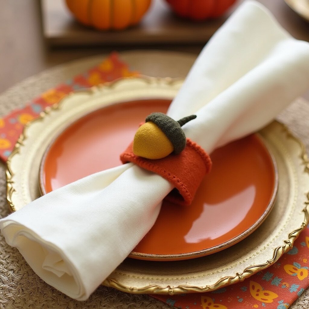 Enhance your autumn table setting with felt acorn napkin rings. These charming little accessories are easy to craft and customize. Cut out acorn tops and bases from felt and glue them together.