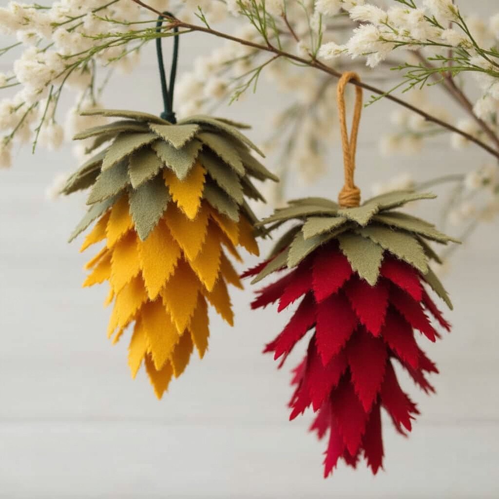 Craft felt pinecone ornaments that can hang from a tree or sit as a table centerpiece. Cut felt into strips, fringe the edges, and roll them into a cone shape for a realistic effect.