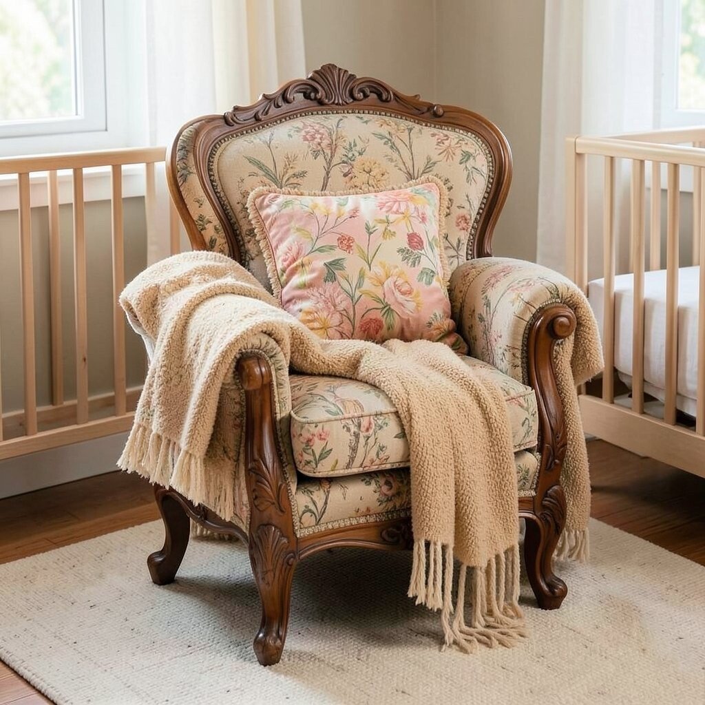 A vintage armchair brings a sense of nostalgia and charm. Think intricate woodwork and fabric that tells a story. It’s a lovely way to add a touch of history to your nursery.