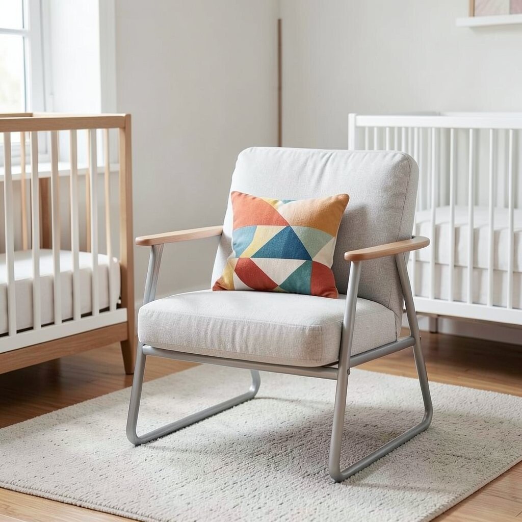 These chairs are budget-friendly and can be spiced up with a colorful throw or a geometric cushion. Minimalist chairs are perfect for contemporary nurseries, offering both style and practicality.