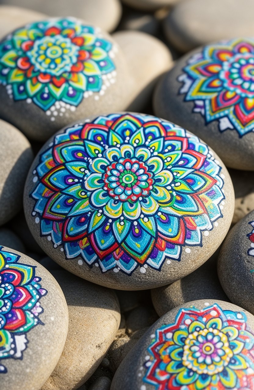 12 favorite mandala painted pebbles can add a splash of color and creativity to your garden, inviting you to brighten your outdoor space in delightful ways.